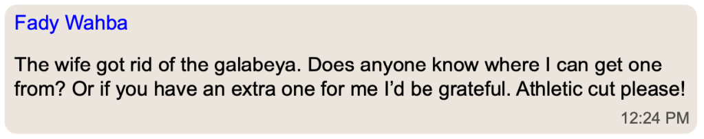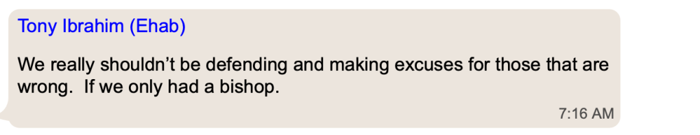 The second I got out of the bathroom, Fady Wahba sent the below message over the church WhatsApp group insinuating about the tank-top I had just put on at the end of his text while also matching an exact part of my documentation to one of the events in the case in the beginning of his text.