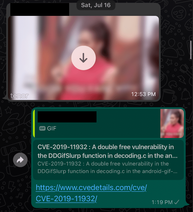 As I realized the cybercrimes which part of it was done through individuals at the Church from my personal community whom are connected to my previous employer Builders Capital in the same organized crime, I responded with a CVE link to a vulnerability linked to GIF messages in reply to a message by an individual whom engaged in the gang-stalking and implications through the texting channel, regardless whether they’re being viewed as witnesses or not at this time. Below was that person’s message over the group and my reply to them with just a link.