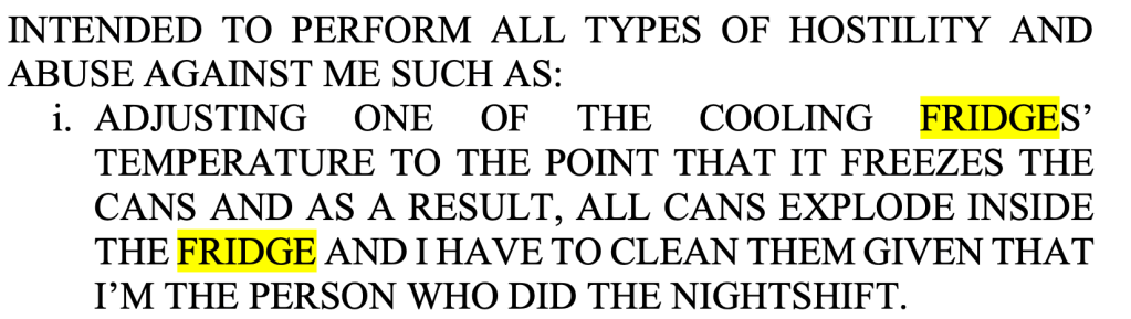 Below is part of my documentation to the abuse, highlighting the word fridge.