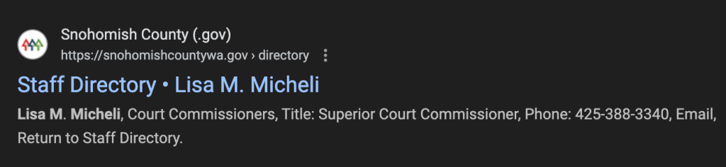 On the contrary, you would expect her name to be topping Google’s search result as below “in the capacity of” Snohomish County Court’s website and not as a standalone business under her own name that is permanently closed which is not accurate.