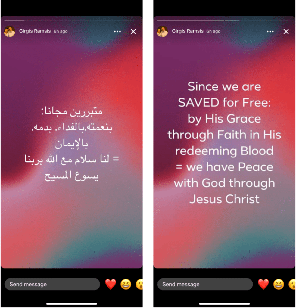 During my trip to Virginia for attempted in-person report to CIA, I saw a story posted on Facebook by Girgis Hafzalla who is one of the Mafia leaders and a corrupt FBI agent, using the stories feature by the platform to implicate about the case through a “custom-written” caption in Arabic and English as below. However, the Arabic writing came in a twisted implicating manner as opposed to the supposedly translation to English that he made in the next story post of his. Below is the screenshot of both stories next to each other.