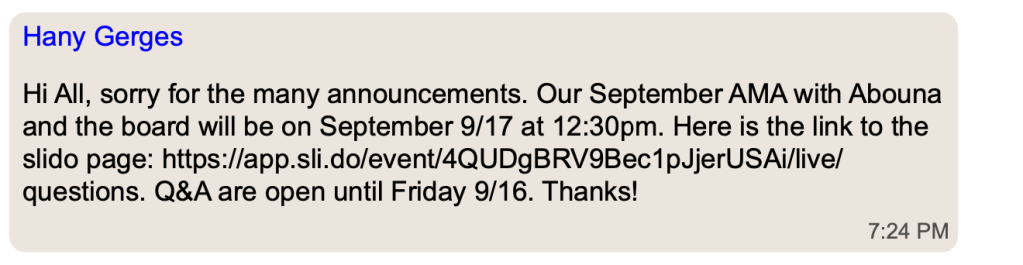Hany (witness) has then sent a message around 1 month after over the church’s WhatsApp group about an AMA event after the liturgy along with a Slido link.