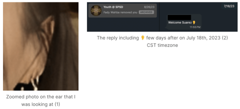 Another day, I came across a photo of an attractive woman on Facebook Friends Suggestions who is connected to the case in someway and noticed that her ear had a unique shape (shown below). I focused in and observed it for a while. A few days later, someone from the church sent a short message over one of the church’s WhatsApp group chats, ending with an ear emoji “👂” which was the only instance that such emoji was shared in any of the lengthy chats over the Church’s various WhatsApp groups.